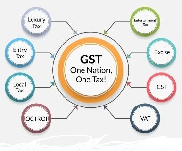 |GST One Nation One Tax diagram explaining replacement of VAT, CST, Excise, Octroi, and other indirect taxes.